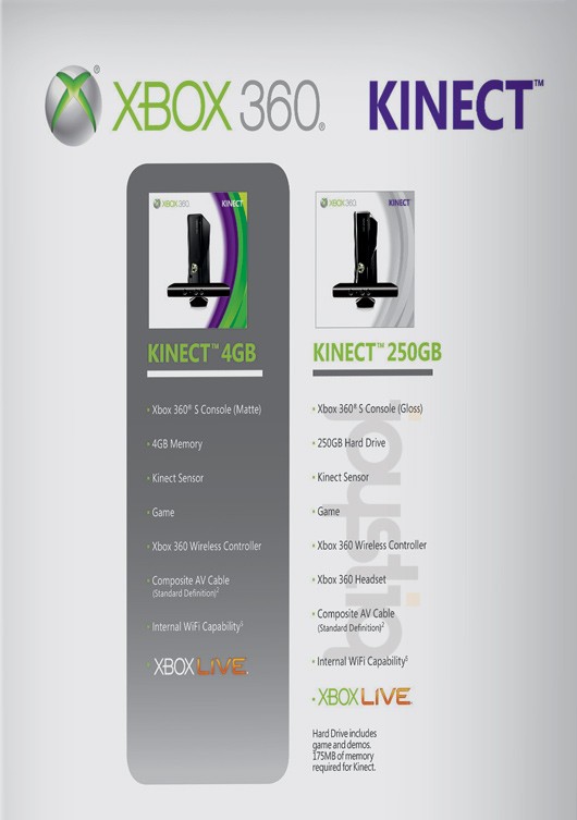 Комплект включает в себя 250GB Xbox 360 S, моушен контроллер Kinect и копию игры Kinect Adventures. Вы получите это все за $ 399 (или £ 300 в UK).